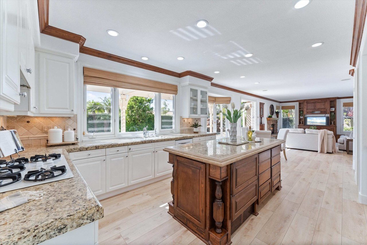 Seamlessly connected to the kitchen, the family room offers stunning built-ins, a stone gas fireplace, and French doors that open onto your dream oasis. You will never need a vacation with this resort-like backyard. Designed for entertainment, this backyard features a sparkling pool and spa with a rock water slide, a covered entertainment room with a TV and fireplace, and a built-in barbecue area with refrigerator and ample bar seating.